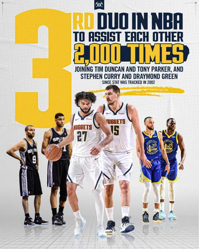 约基奇与穆雷互相送出至少2000次助攻,成为历史第3对达成该成就组合,比肩库里与追梦,邓肯与帕克。
