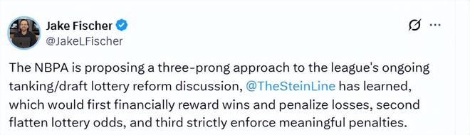 一位联盟消息人士向The Athletic表示:“如果没有更严格的处罚,依然会出现各种离谱操作。必须出台足够严厉的措施,让球队在摆烂前真正三思。一旦有球队尝试摆烂并被抓包,其他球队也要看到处罚后果,明白这么做得不偿失。”