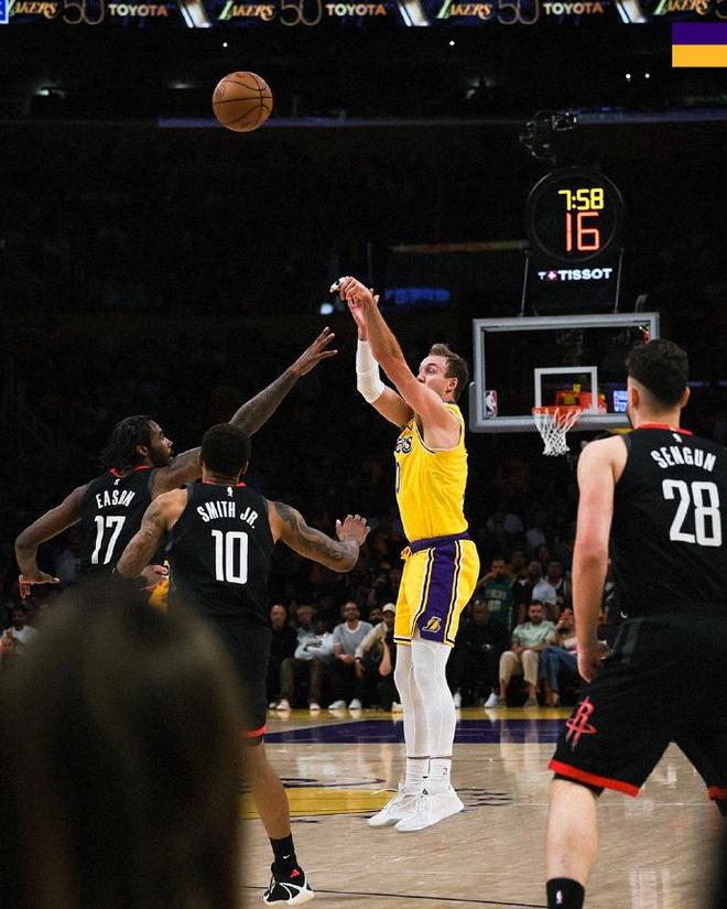 更为关键的是,肯纳德在末节再中3记三分再得9分,屡屡用关键三分粉碎火箭的追分,成为湖人赢球的头号奇兵球员。