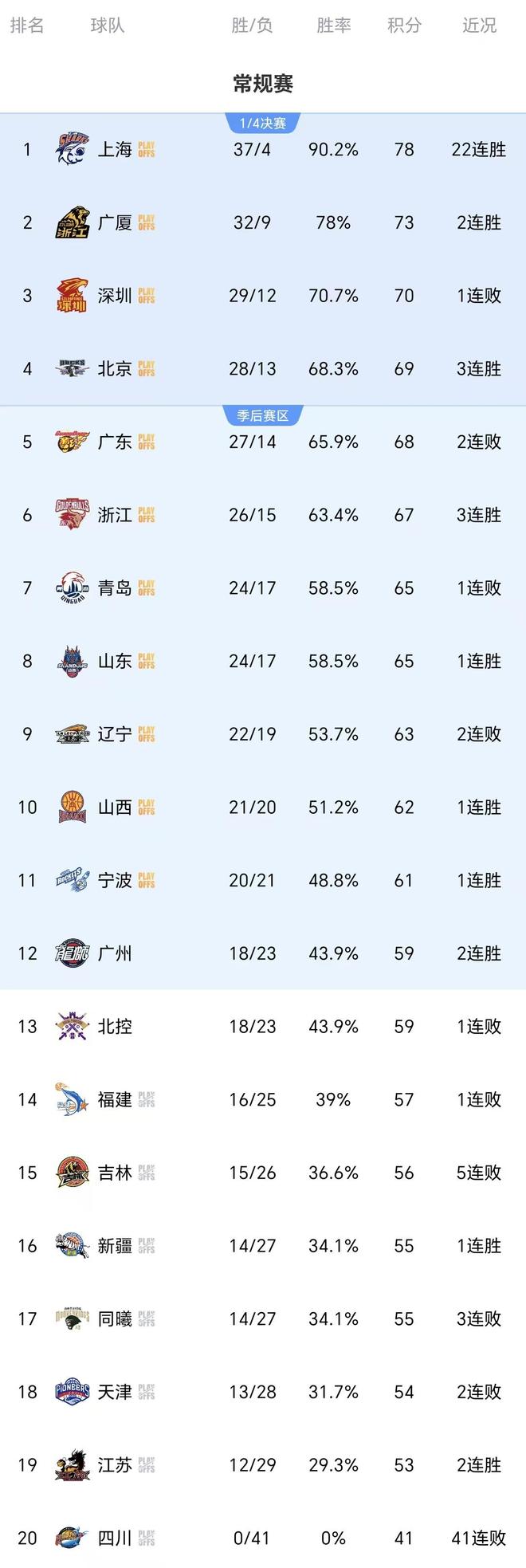 与此同时,广东队提前一轮锁定第五名,确定季后赛12进8轮次的对手是常规赛第12名的球队,目前还没有确定,将在广州队、北控队之间产生,以上两队竞争季后赛最后一个晋级名额,本周五晚上揭晓答案。