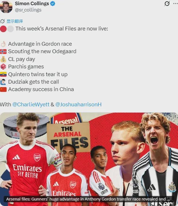 太阳报阿森纳跟队记者SC表示,安东尼-戈登是阿森纳在边锋位置上的首要目标,他有可能以7500万英镑的价格加盟,此外,SC指出枪手在这笔交易中相比其他竞争对手有巨大的优势,因为戈登更想去伦敦而不是其他城市。