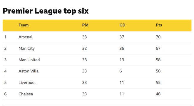 阿森纳和曼城早已确保前五的排名,曼联、维拉和利物浦将拿走另外3个参赛名额,下赛季英格兰仍然至少有5支欧冠参赛队。