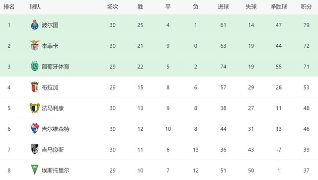 值得一提的是,在本菲卡击败葡萄牙体育之后,波尔图2-0击败了通德拉。目前他们已经甩开葡萄牙体育8分,哪怕后者补赛获胜,双方的差距还有5分。不出意外的话,本赛季波尔图已经基本锁定了联赛冠军,接下来葡超最大的悬念,就是本菲卡和葡萄牙体育,谁能拿到第二名,参加下赛季的欧冠!