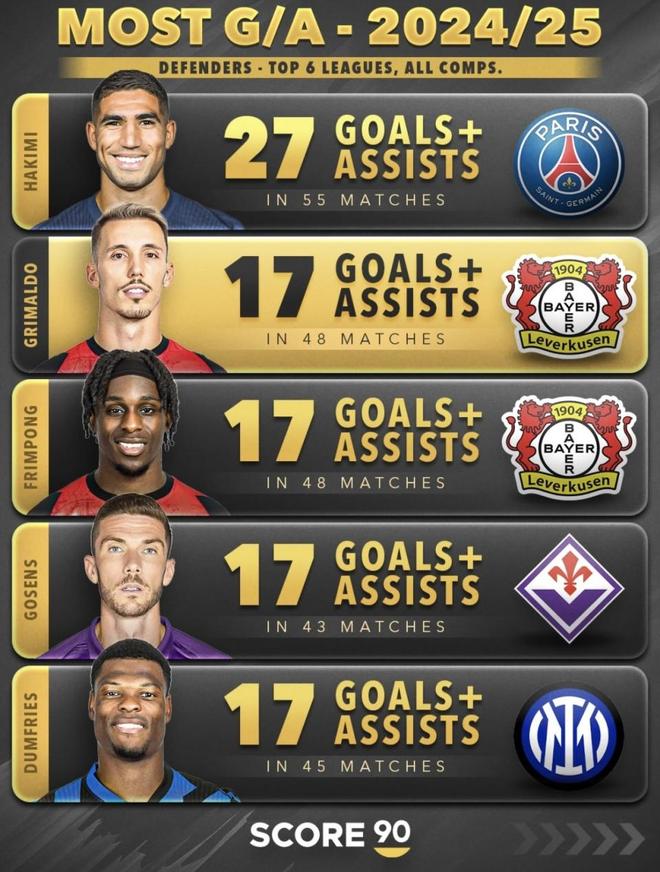 最近 Score90 连续发了三张五大联赛后卫参与进球榜,格里马尔多的名字这三年一直都在第一梯队。直接看数据:2023/24赛季51场参与32球,场均0.63;2024/25赛季48场参与17球,场均0.35;2025/26赛季39场参与25球,场均0.64。三年下来一共参与74个进球,平均每年24.7次。对于一个后卫来说,这个产出量非常夸张。更重要的是,他不是只爆了一年,而是经历了高光、回落,第三年再次杀回榜单第一。把这三张榜单连起来看,他最强的地方在于三年里两次拿第一,并且从未掉出过前排。